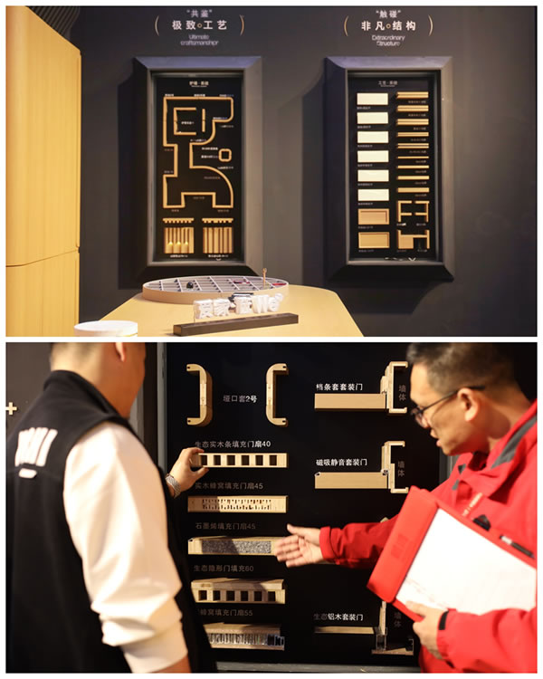 作為此次展會(huì)的"現(xiàn)象級(jí)"展品,鵬鴻工法墻以模塊化系統(tǒng)思維,通過"解構(gòu)式"陳列,將工藝系統(tǒng)、木門系統(tǒng)與護(hù)墻系統(tǒng)整合,58個(gè)工藝模塊覆蓋結(jié)構(gòu)、裝飾與功能三大維度,清晰呈現(xiàn)全屋定制的工藝系統(tǒng)。
